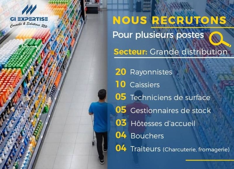 Offre d’Emploi : Rayonnistes (13), Caissières (06), Techniciens de Surface (03) (H/F) 📍 Lieu : Conakry📅 Date de publication : [à compléter]🕒 Type de contrat : Stage / CDD📌 Nombre de postes : 22 🏢 Description du poste GI EXPERTISE étant un cabinet de conseil en ressources humaines spécialisé dans le recrutement, l’intérim et l’externalisation