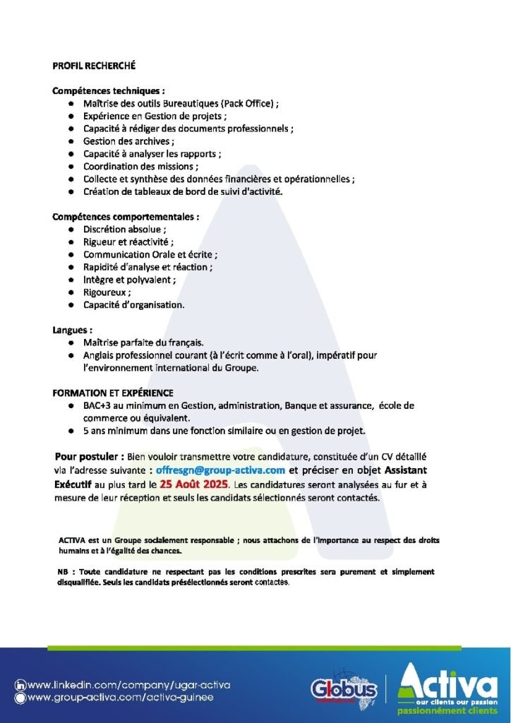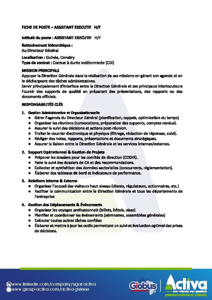ACTIVA GUINEE RECRUTE ASSISTANT EXECUTIF H/F