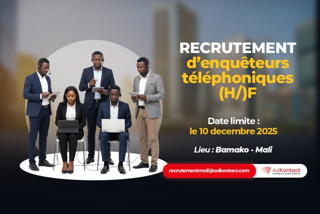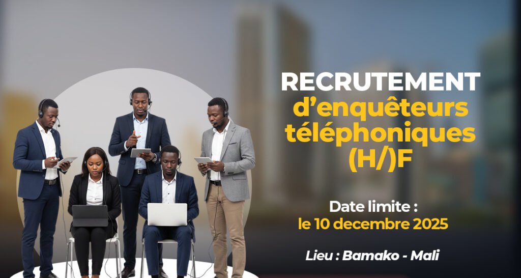 Dans le cadre de la mise en œuvre d’une enquête d’opinion portant sur la situation politique et socio-sécuritaire au Mali, nous lançons un appel à candidatures pour le recrutement d’enquêteurs téléphoniques. L’objectif de cette enquête est de collecter des données fiables, confidentielles et représentatives afin d’alimenter l’analyse nationale.