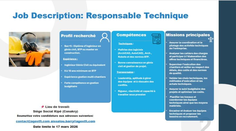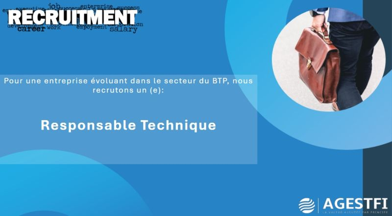 Dans le cadre du renforcement de ses activités, une entreprise évoluant dans le secteur du Bâtiment et des Travaux Publics (BTP) recrute un (e) Responsable Technique.