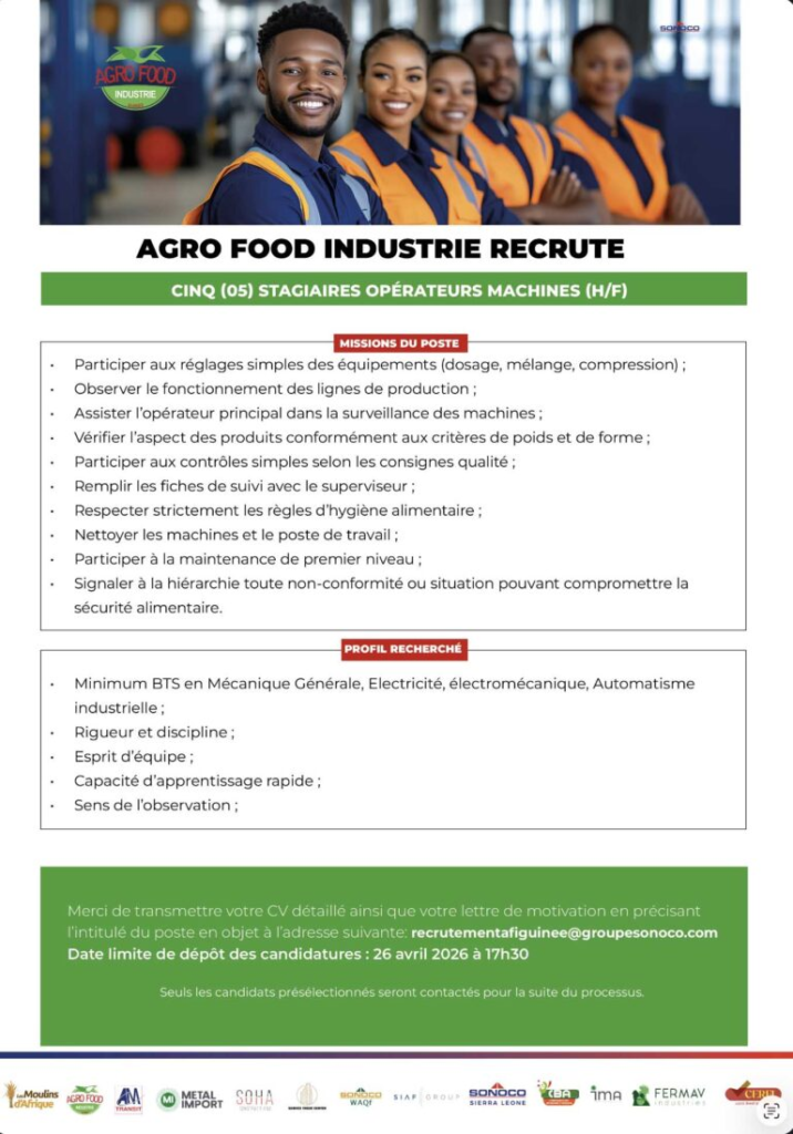 AGRO FOOD INDUSTRIE RECRUTE 05 STAGIAIRES H/F