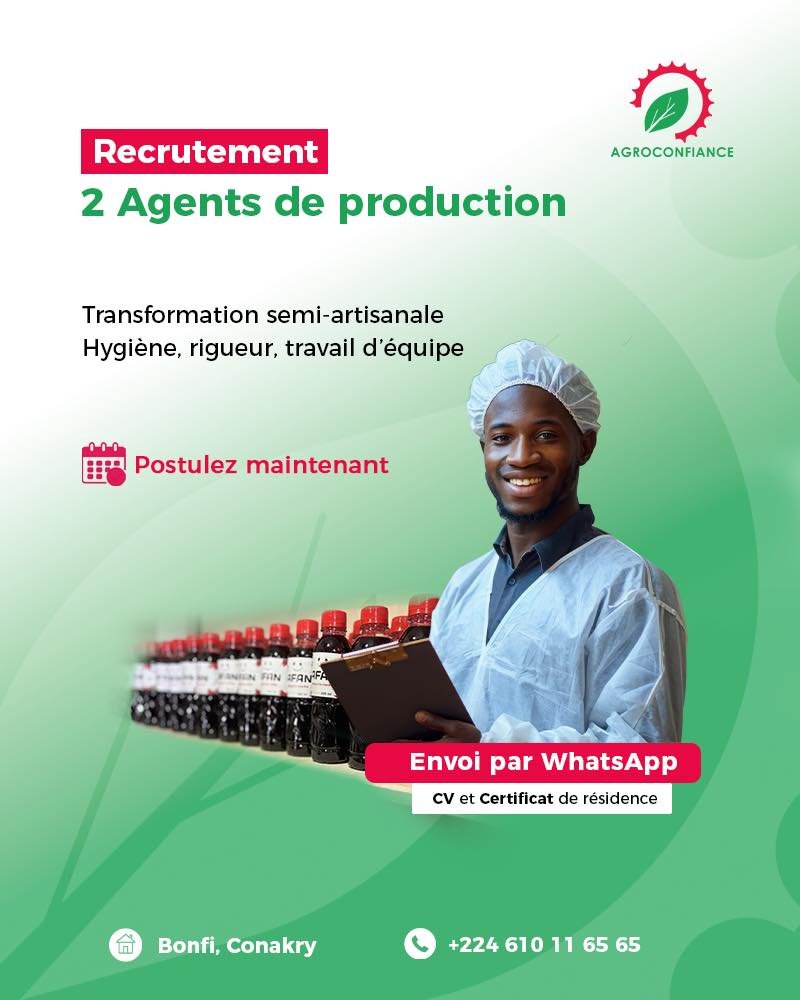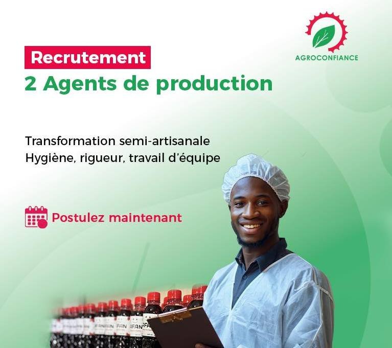RECRUTEMENT DE DEUX (2) AGENTS DE 𝗣𝗥𝗢𝗗𝗨𝗖𝗧𝗜𝗢𝗡 AGROALIMENTAIRE (H/F)
