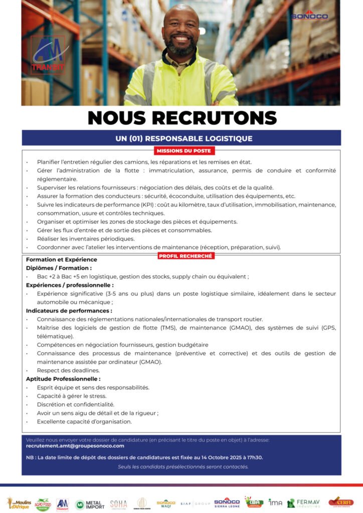 NOUS RECRUTONS UN (01) RESPONSABLE LOGISTIQUE