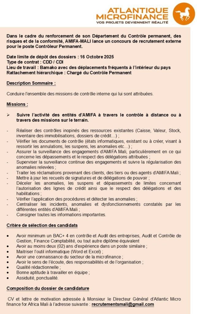 AMIFA MALI RECRUTE CONTROLEUR PERMANENT H/F