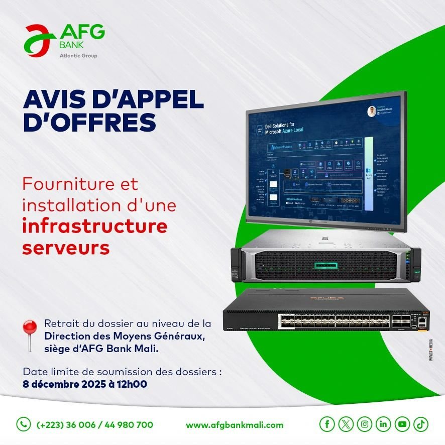 AFG Bank Mali lance un appel d’offres pour la fourniture, l’installation et la mise en service d’une infrastructure serveurs et réseau.