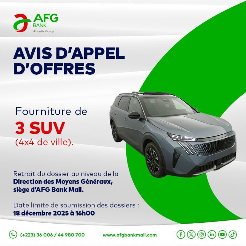 AFG Bank Mali lance un appel d’offres pour la fourniture de trois (3) SUV (4×4 de ville).