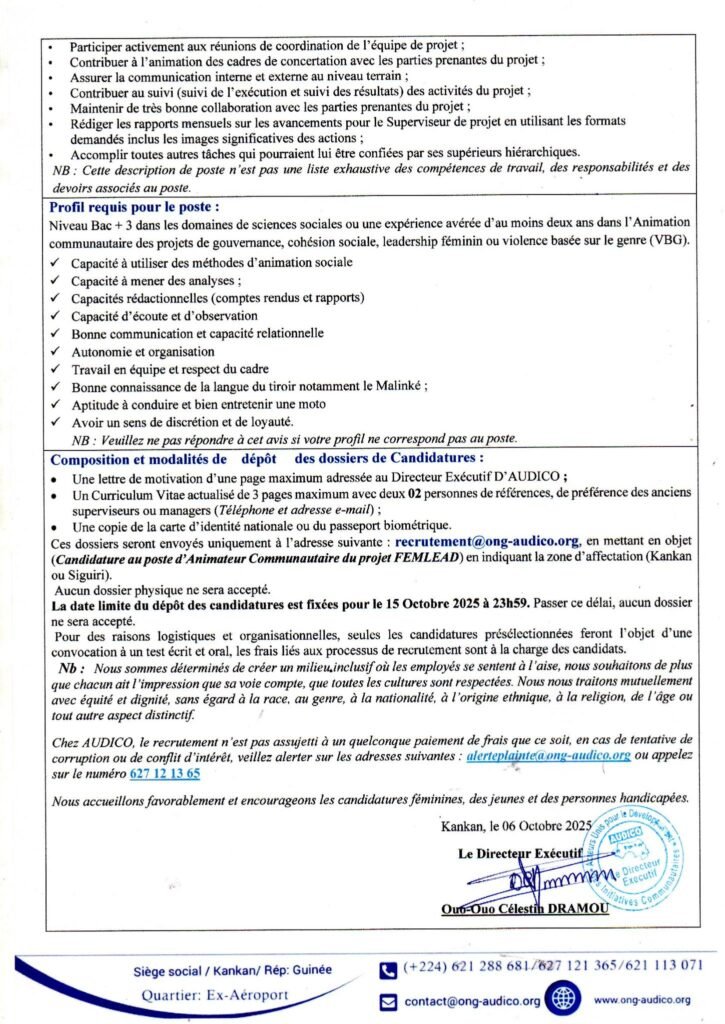 (Candidature au poste d’Animateur Communautaire du projet FEMLEAD) en indiquant la zone d’affectation (Kankan