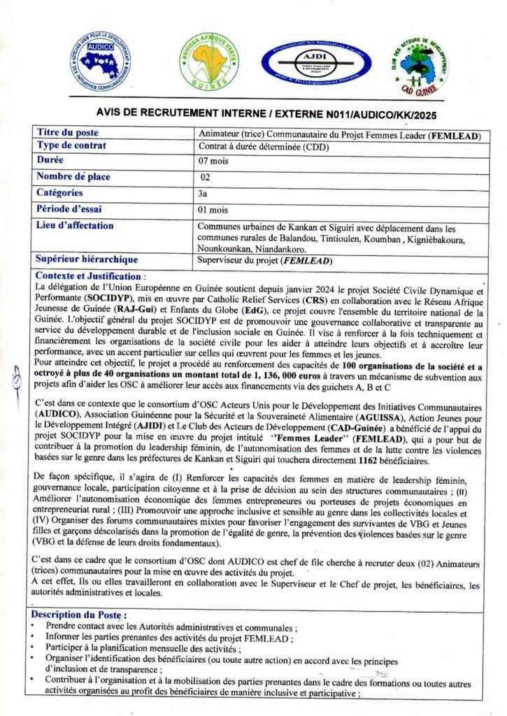 AVIS DE RECRUTEMENT INTERNE/EXTERNE N011/AUDICO/KK/2025