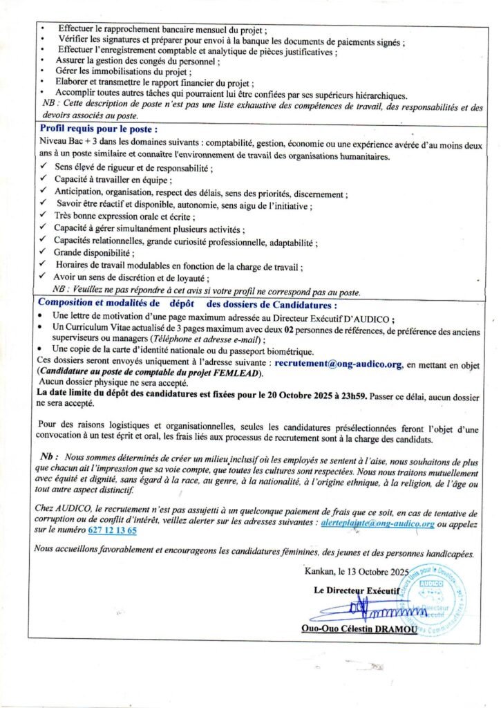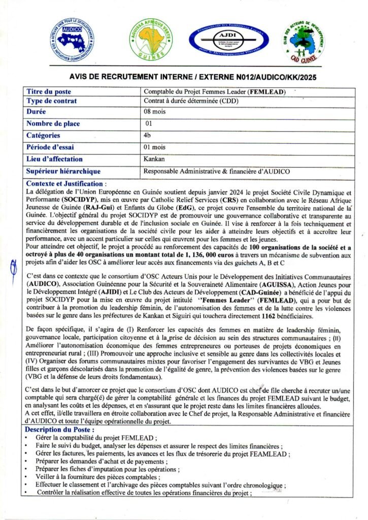 AVIS DE RECRUTEMENT INTERNE/EXTERNE N012/AUDICO/KK/2025