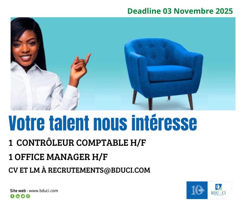 À l’adresse recrutements@bduci.com avec en objet « OFFICE MANAGER» au plus tard le 03 Novembre 2025.