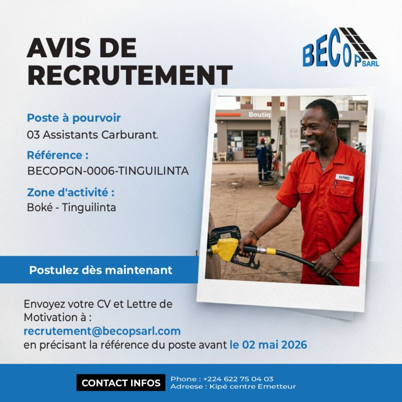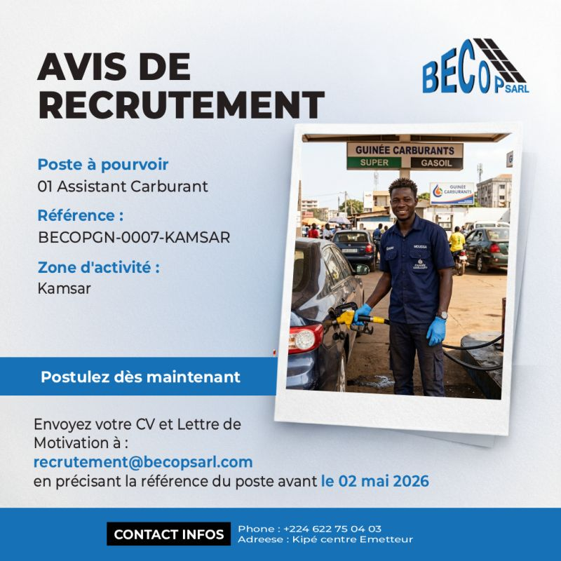 Envoyez votre CV + lettre de motivation à : recrutement@becopsarl.com avec la réference du poste BECOPGN-0007-KAMSAR en objet