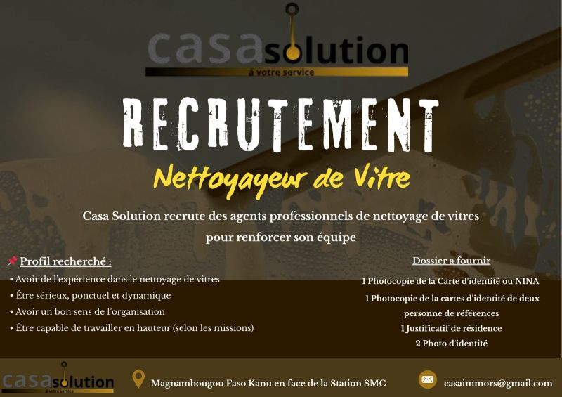 CASA SOLUTION RECRUTE DES NETTOYEURS DE VITRES H/F