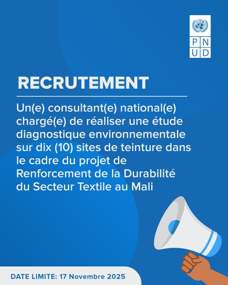 Le PNUD Mali un(e) consultant(e) national(e) chargé(e) de réaliser une étude diagnostique environnementale sur dix (10) sites de teinture dans le cadre du projet de Renforcement de la Durabilité du Secteur Textile au Mali.Date limite 📅 : 17 novembre 2025Postulez ici 👉 : https://lnkd.in/et5egRmMLes candidatures féminines ainsi que celles des personnes en situation de handicap […]