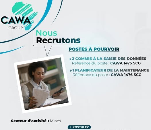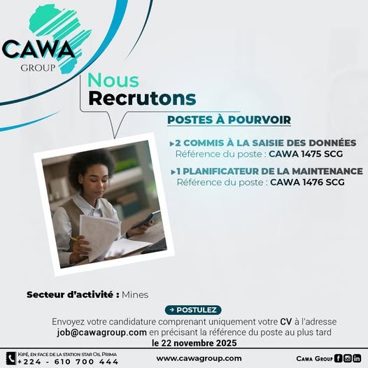 CAWA Guinée recrute plusieurs postes pour une entreprise spécialisée dans le secteur minier basée en République de Guinée