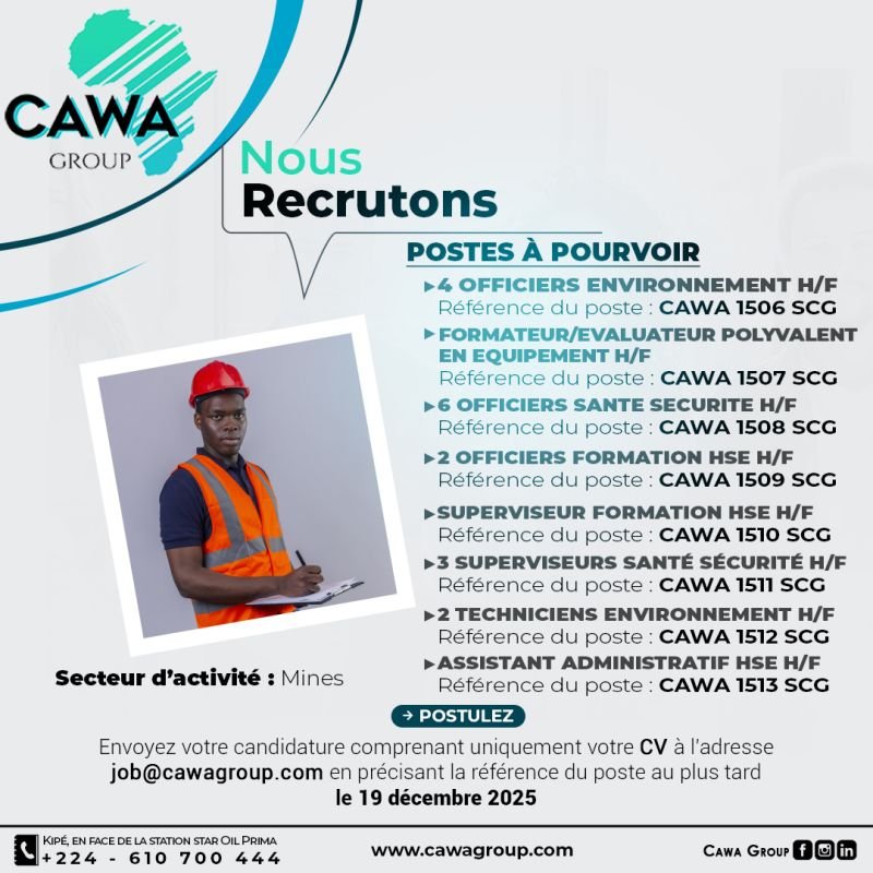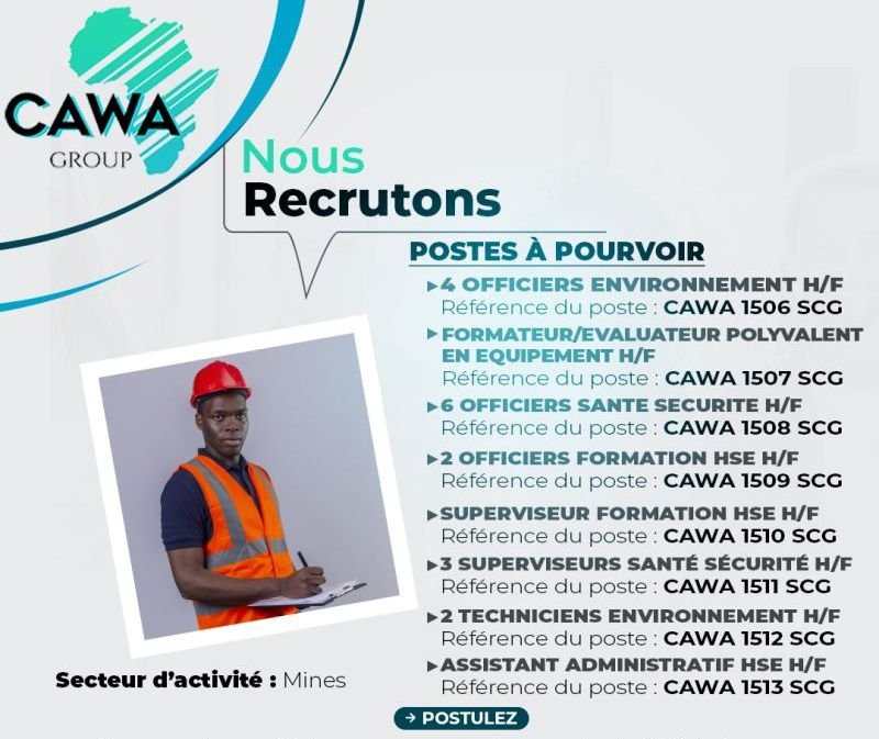CAWA Guinée recrute plusieurs postes pour une entreprise spécialisée dans le secteur minier basée en République de Guinée