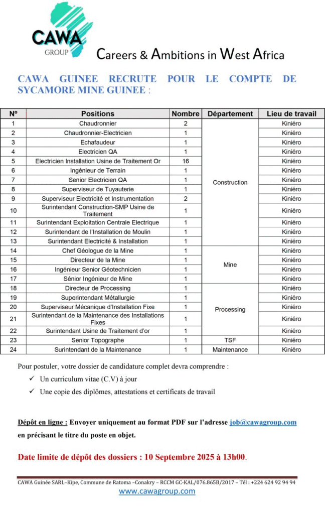 CAWA GUINEE RECRUTE POUR LE COMPTE DE SYCAMORE MINE GUINEE :