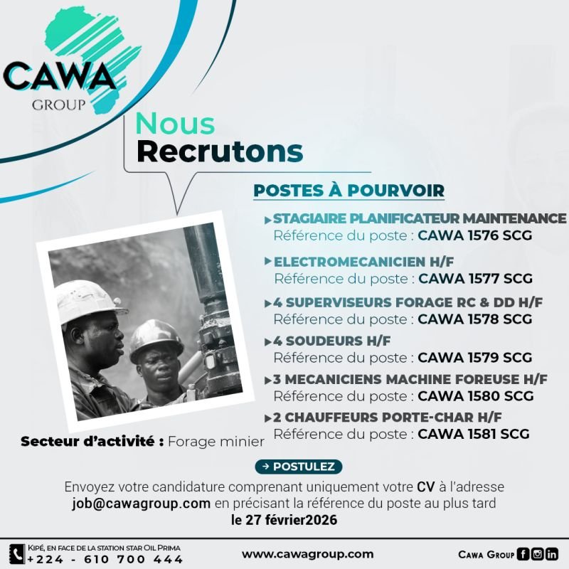 CAWA Guinée recrute plusieurs postes pour une entreprise spécialisée dans le forage minier basée en République de Guinée