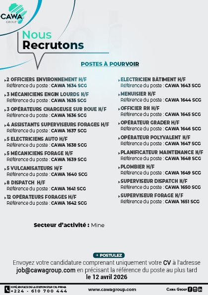 CAWA Guinée recrute plusieurs postes pour une entreprise spécialisée dans le secteur minier basée en République de Guinée