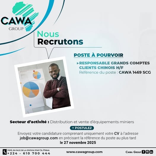 CAWA GUINEE RECRUTE RESPONSABLE GRANDS COMPTES CLIENTS CHINOIS H/F