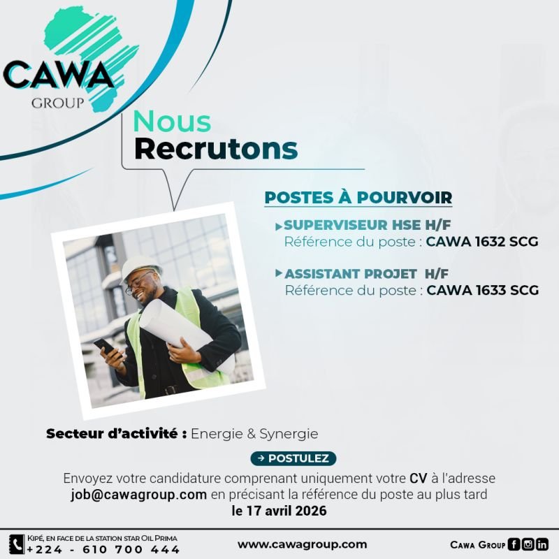 CAWA Guinée recrute plusieurs postes pour une entreprise spécialisée dans le secteur de l’énergie basée en République de Guinée