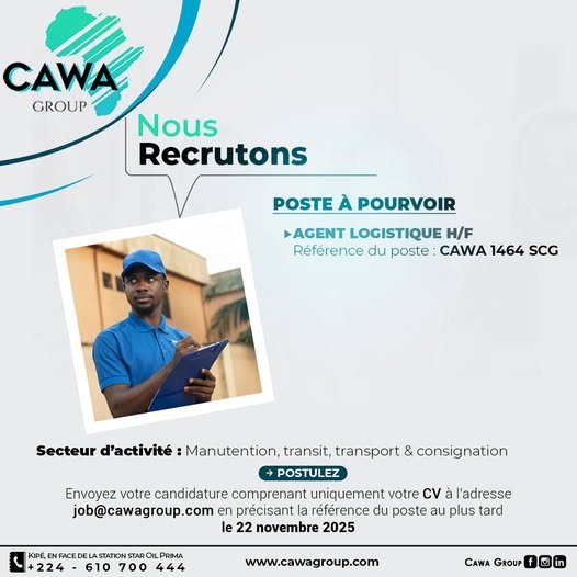 CAWA Guinée recrute pour le compte d’une entreprise spécialisée dans la manutention, le transit, le transport & la consignation basée en République de Guinée.