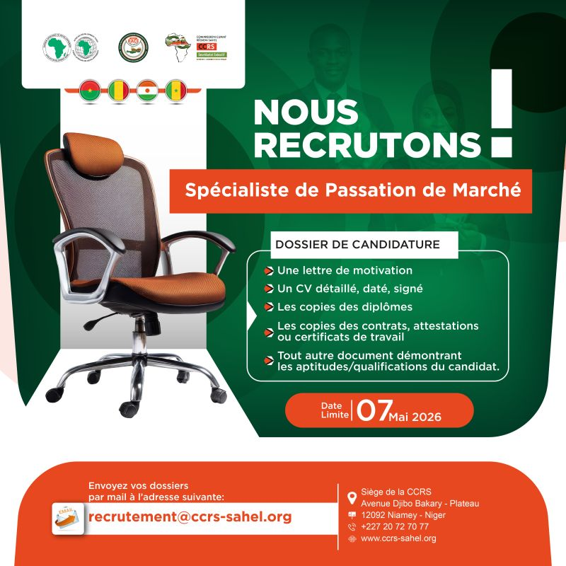 La Commission Climat pour la RĂ©gion du Sahel (#CCRS), dans le cadre du Projet RACE-Sahel financĂ© par la Banque Africaine de DĂ©veloppement (#BAD), lance un appel Ă  candidatures pour le recrutement d’un(e) SpĂ©cialiste en Passation de MarchĂ©s de l’UnitĂ© de Gestion du Projet.