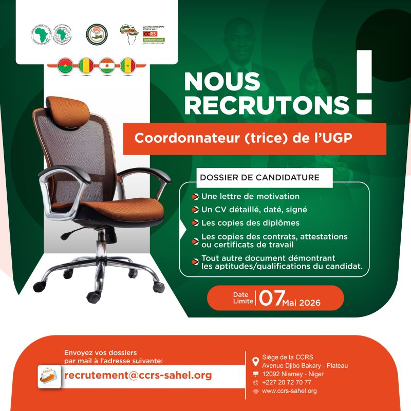 La Commission Climat pour la RĂ©gion du Sahel (CCRS), dans le cadre du Projet RACE-Sahel financĂ© par African Development Bank Group (BAD), lance un appel Ă  candidatures pour le recrutement d’un(e) Coordonnateur(trice) de l’UnitĂ© de Gestion du Projet.