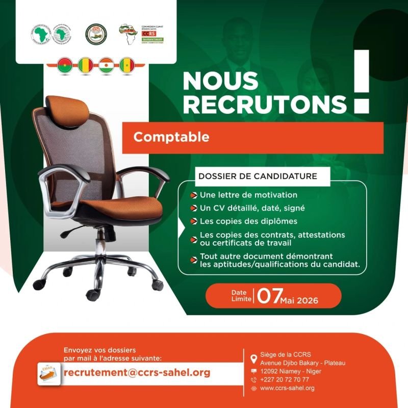 La Commission Climat pour la RĂ©gion du Sahel (CCRS), dans le cadre du Projet RACE-Sahel financĂ© par la Banque Africaine de DĂ©veloppement (BAD), lance un appel Ă candidatures pour le recrutement d’un(e) Comptable de l’UnitĂ© de Gestion du Projet.