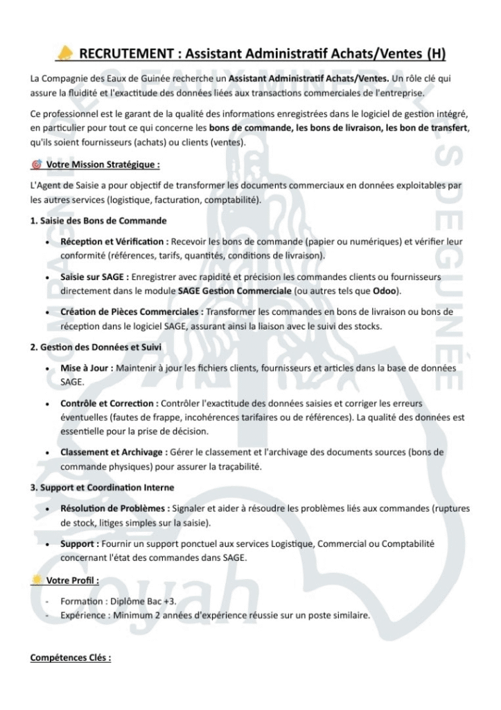 La Compagnie des Eaux de Guinée recherche un Assistant Administratif Achats/Ventes. Un rôle clé qui