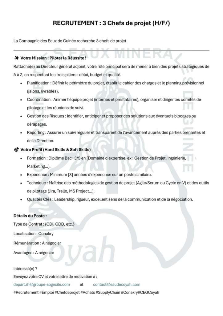 La Compagnie des Eaux de Guinée recherche 3 chefs de projet.