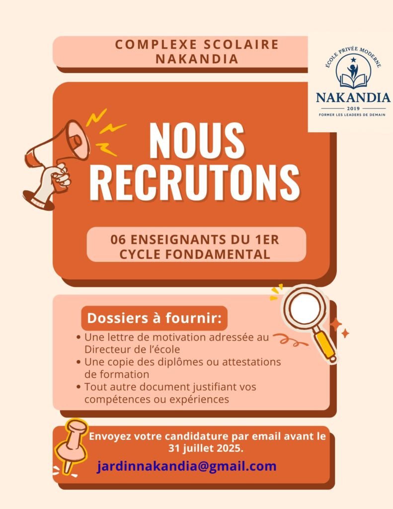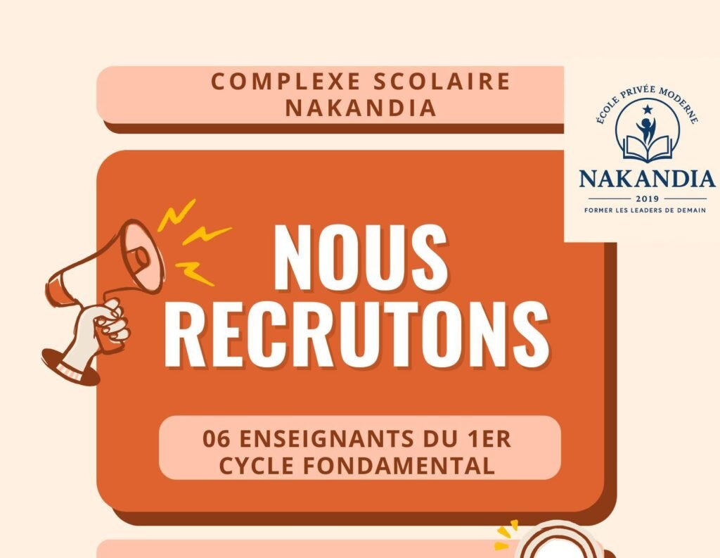 Lโรcole Nakandia lance un appel ร candidatures pour le recrutement de 06 enseignants du premier cycle fondamental, pour les classes de 1รจre ร la 6รจme annรฉe.