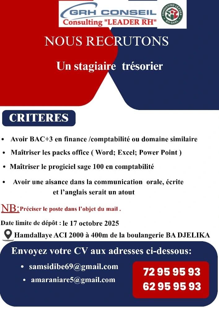 Envoyez votre CV aux adresses ci-dessous: - samsidibe69@gmail.com