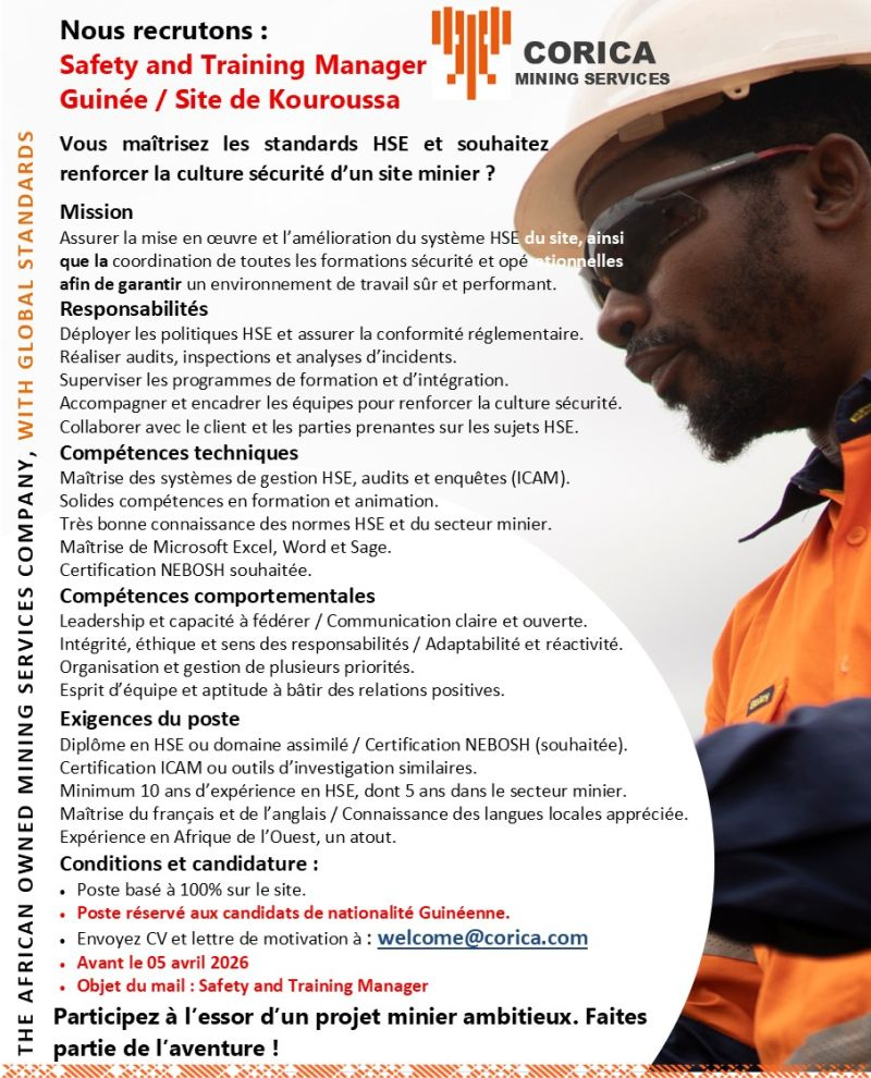 CORICA MINING GUINEE RECRUTE SAFETY AND TRAINING MANAGER H/F