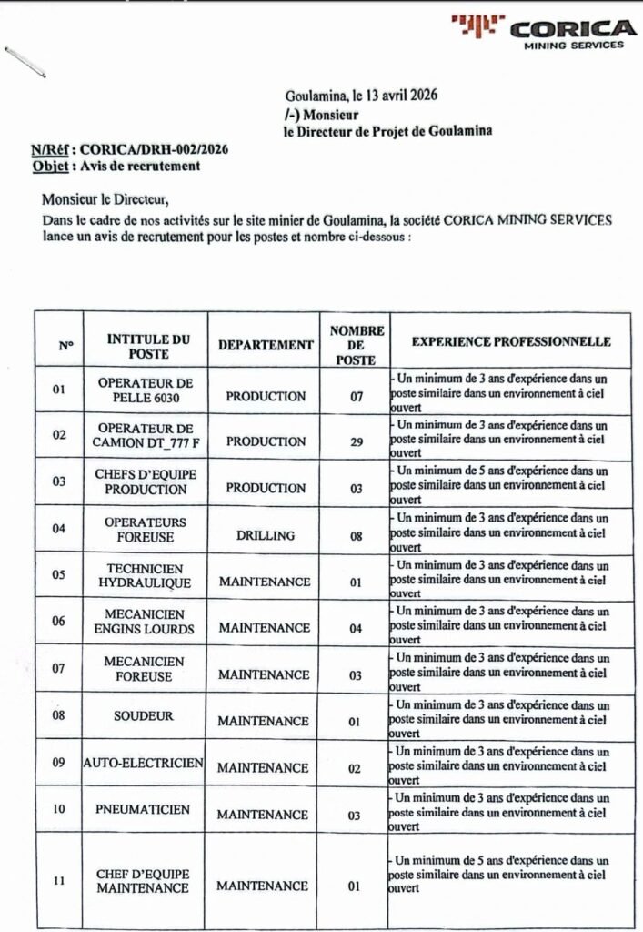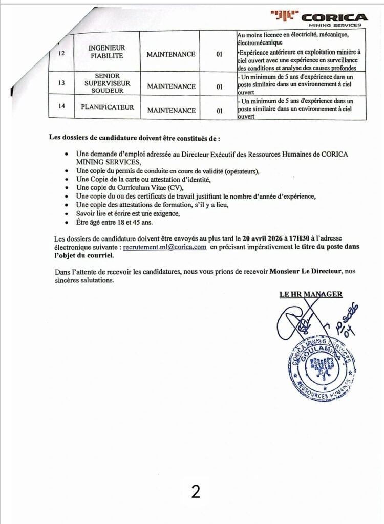 CORICA MINING SERVICES RECRUTE 65 POSTES H/F , les details sur les images ci-dessous, vous pouvez zoomer pour mieux voir