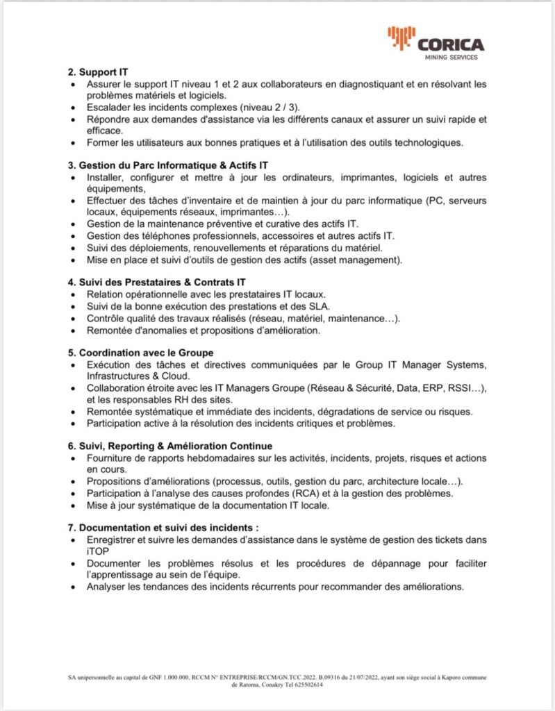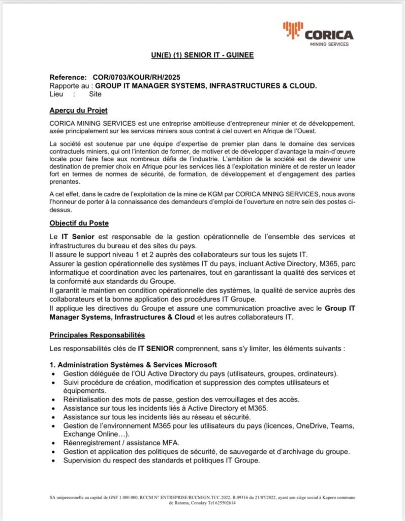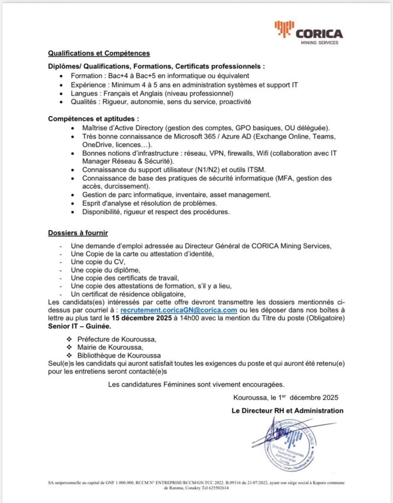 - Un certificat de résidence obligatoire, Les candidats(es) intéressés par cette offre devront transmettre les dossiers mentionnés ci- dessus par courriel à recrutement.coricaGN@corica.com ou les déposer dans nos boîtes à lettre au plus tard le 15 décembre 2025 à 14h00 avec la mention du Titre du poste (Obligatoire) Senior IT-Guinée.
