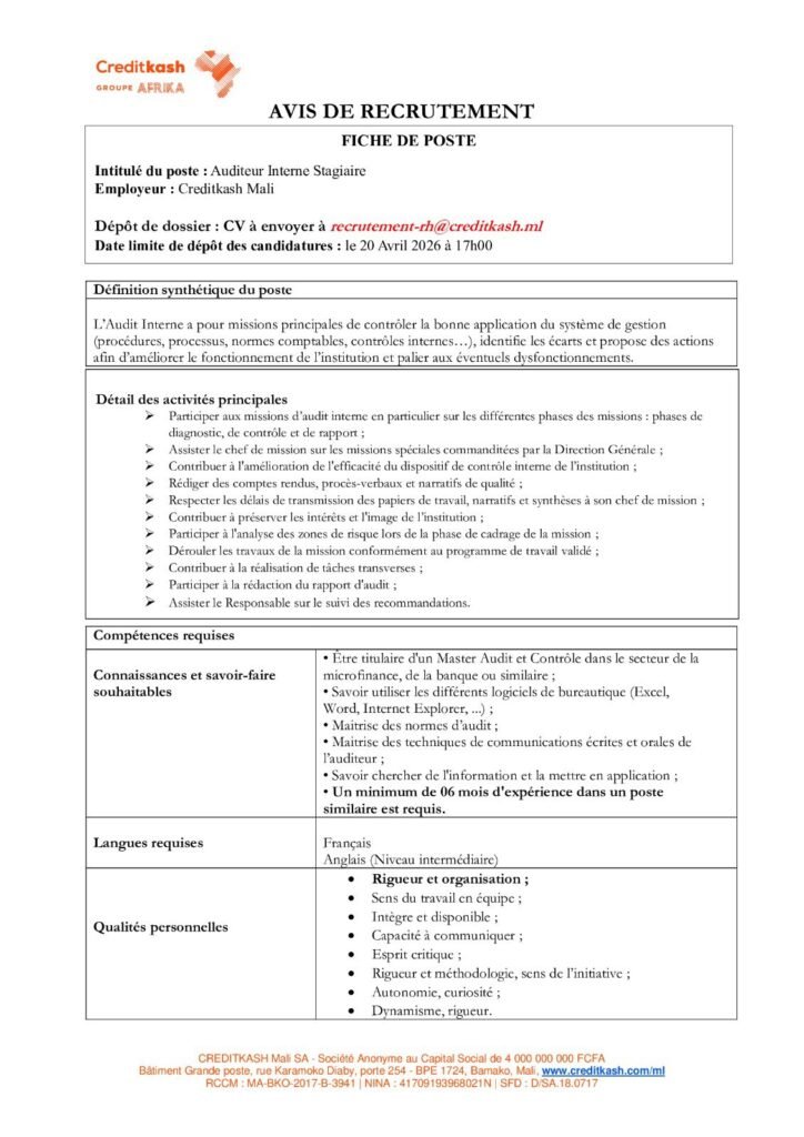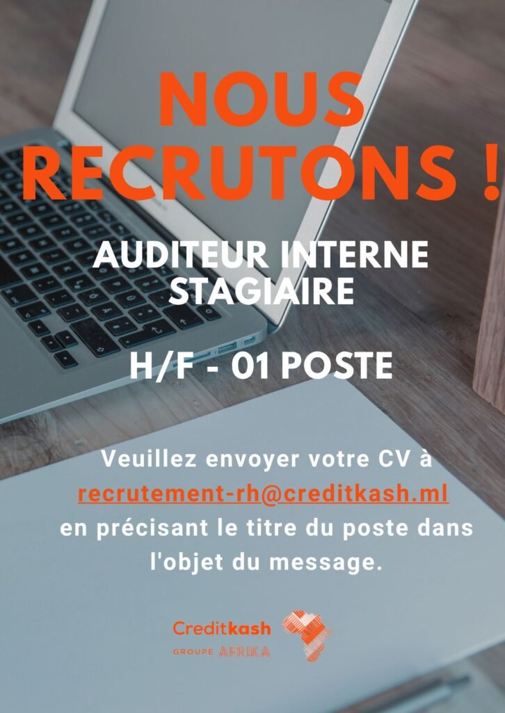 CREDIT KASH MALI RECRUTE STAGIAIRE AUDITEUR INTERNE H/F