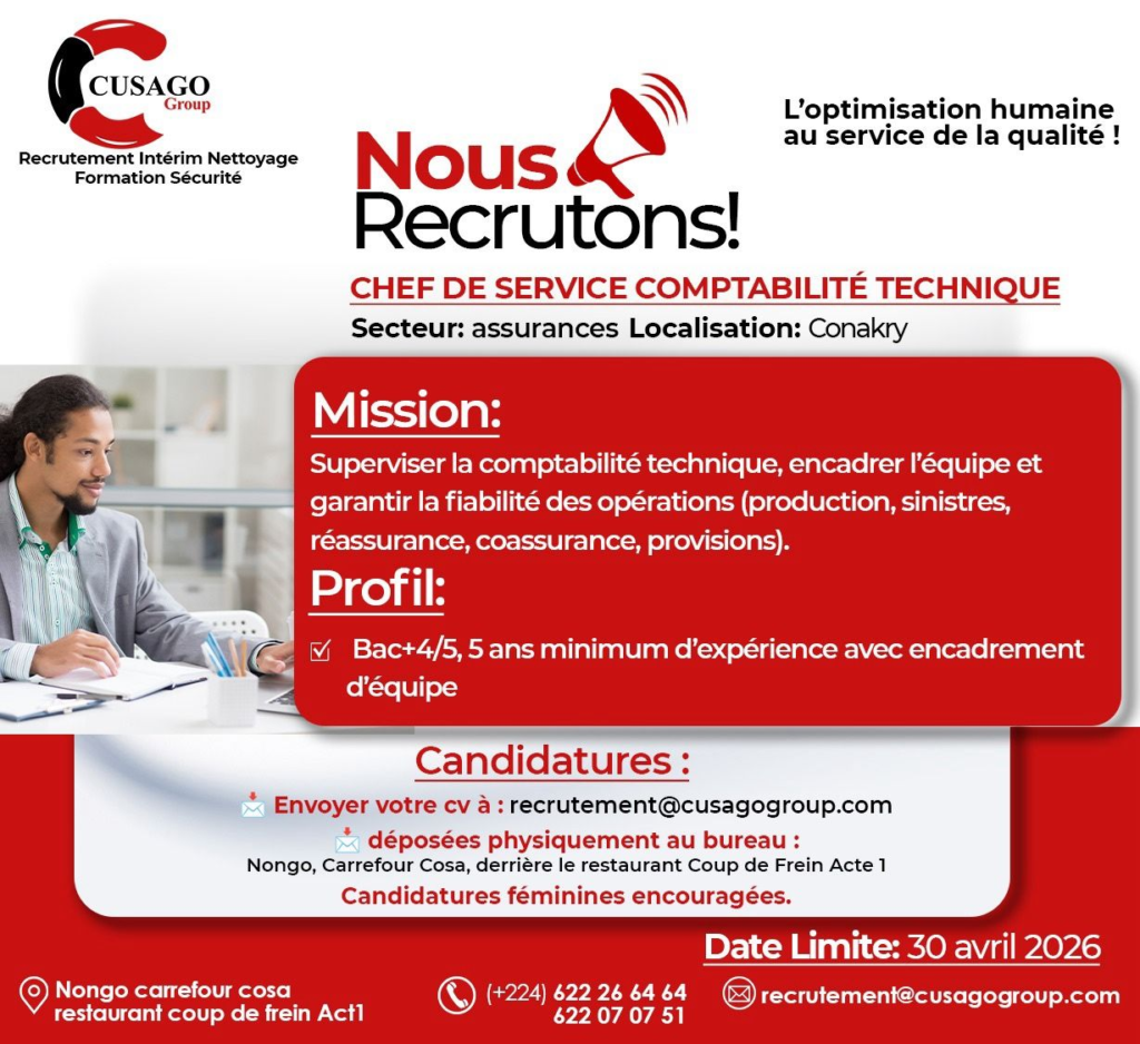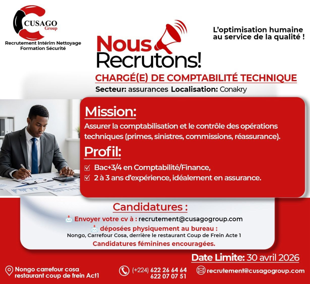 Dans le cadre d’un recrutement pour un client basé à Conakry, Cusago Group recherche des profils qualifiés en comptabilité pour renforcer ses équipes.