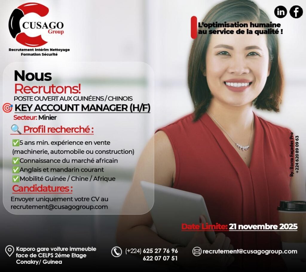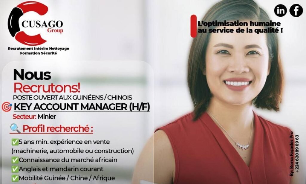 Cusago Group recrute pour un partenaire du secteur minier un(e) Key Account Manager – Clients Chinois.