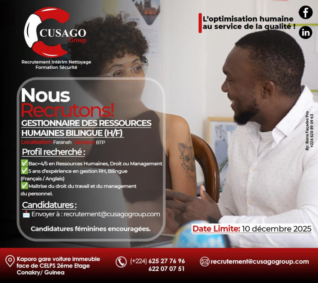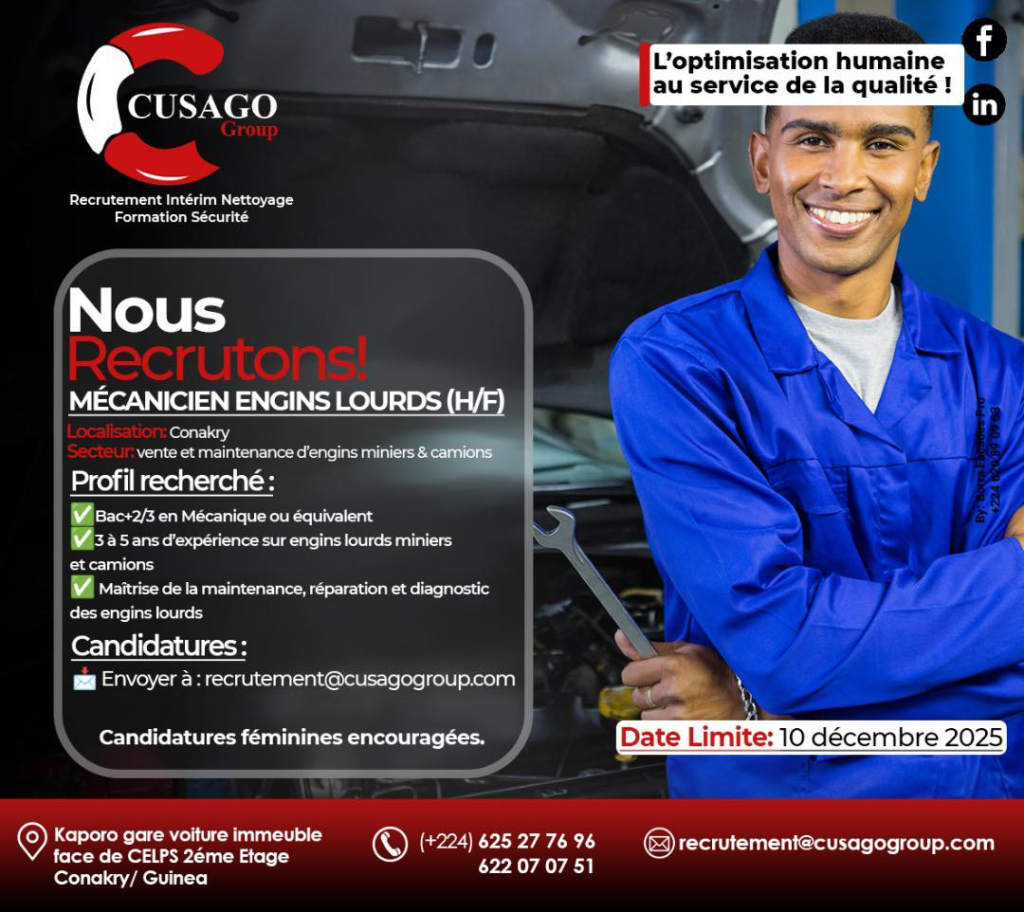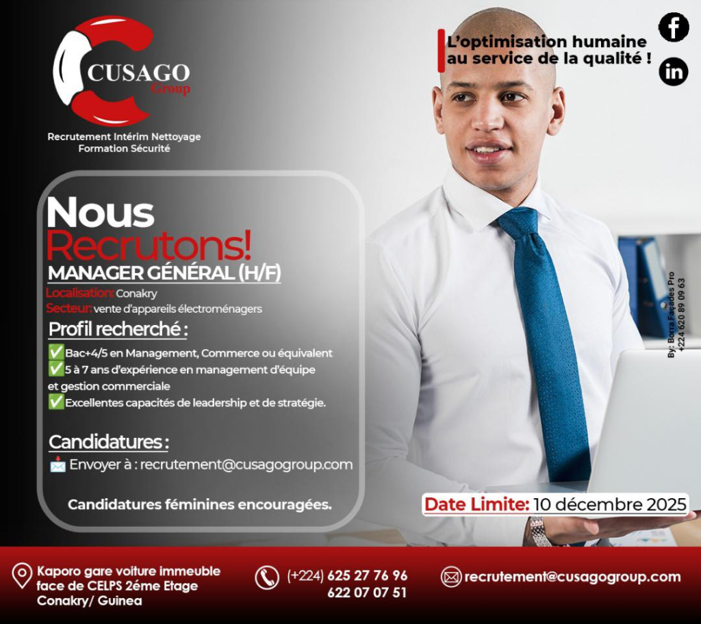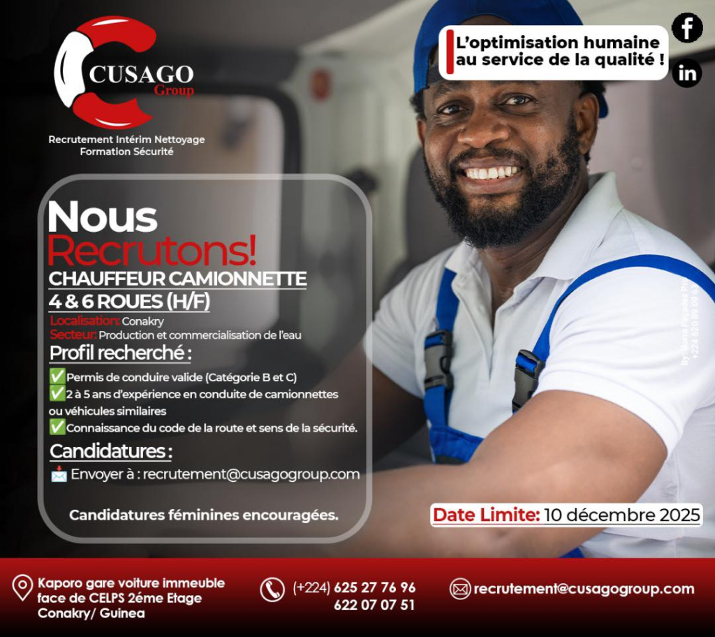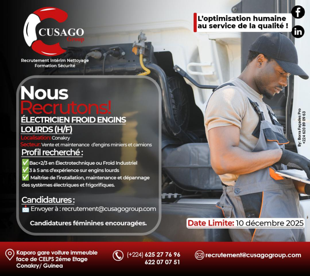 Nous ouvrons plusieurs postes à Conakry et Faranah pour nos partenaires : nettoyage, agroalimentaire, BTP, électroménager, maintenance d’engins…