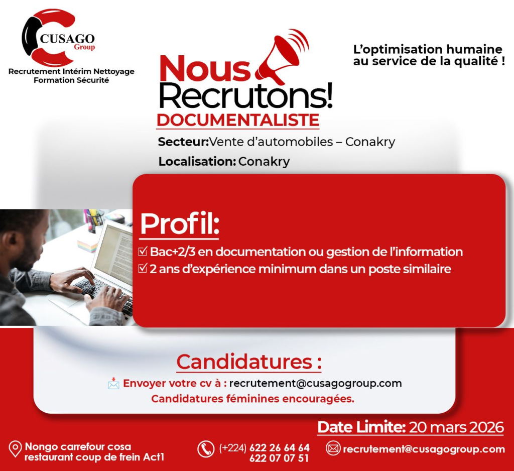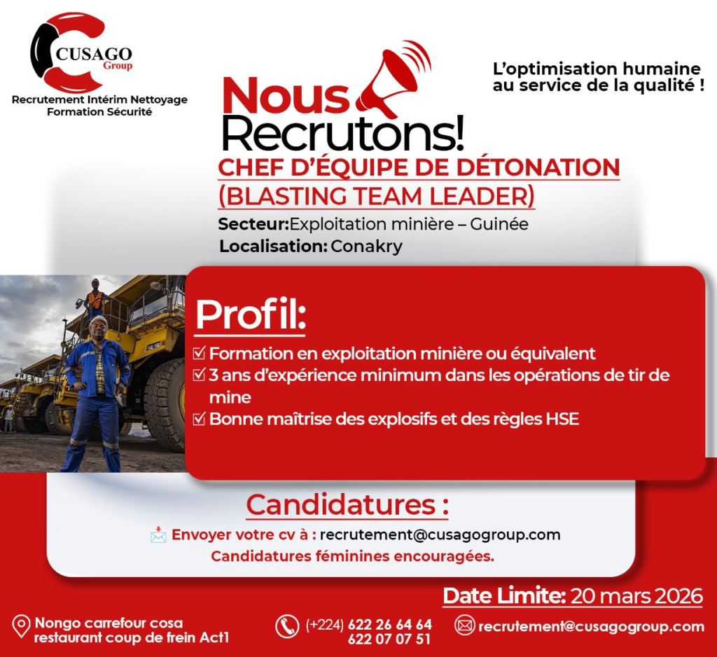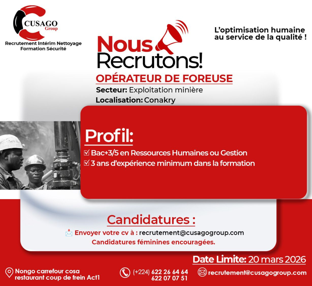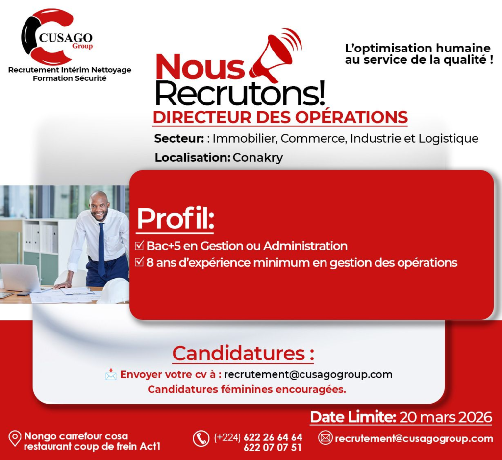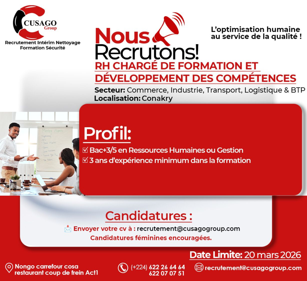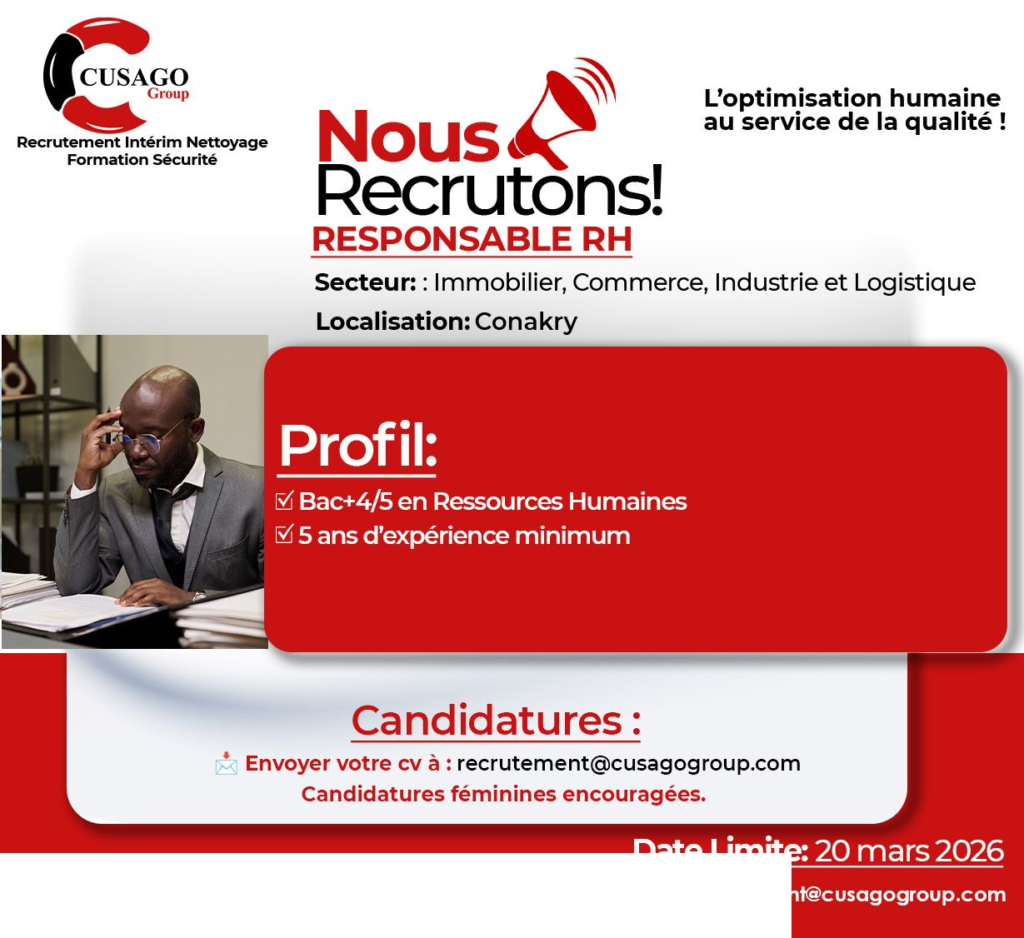 Le cabinet Cusago Group, spécialisé en recrutement et conseil RH, recrute pour le compte de plusieurs entreprises partenaires évoluant dans divers secteurs en Guinée.