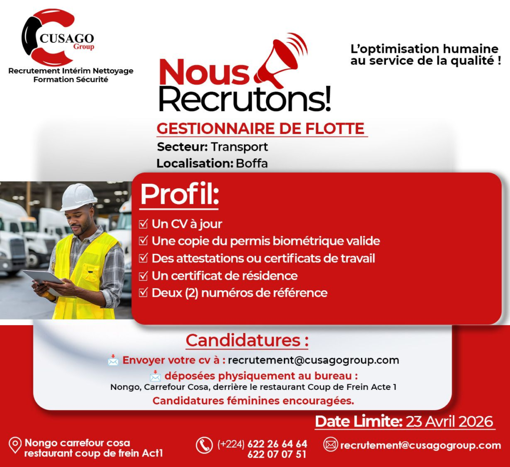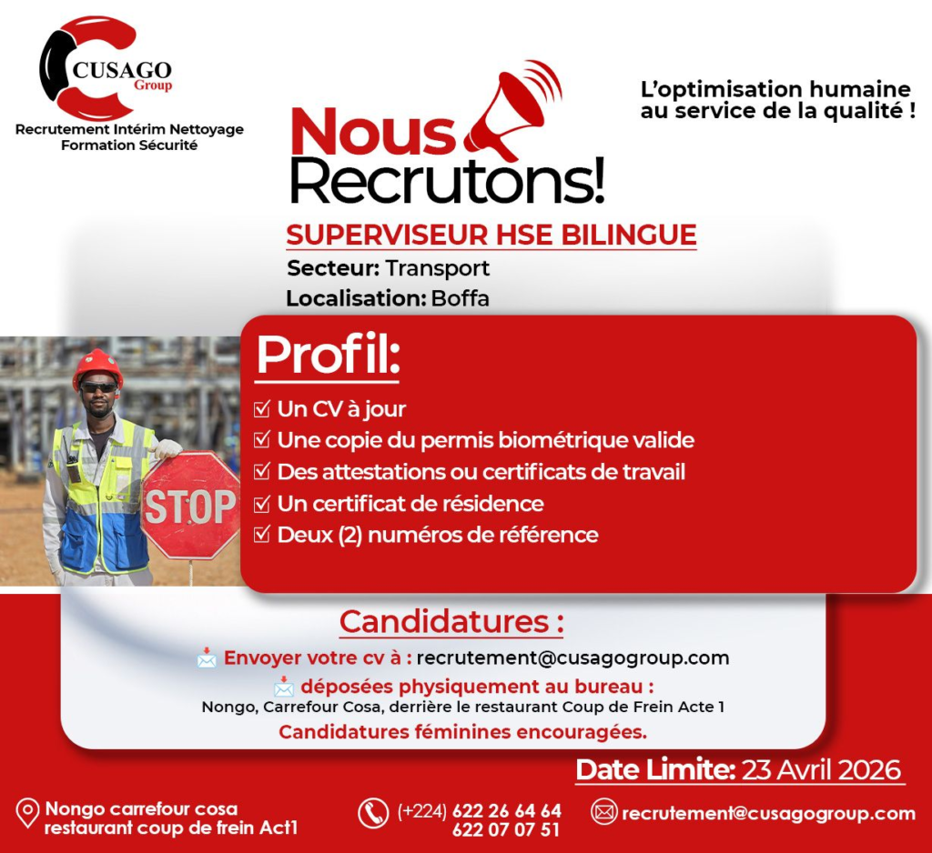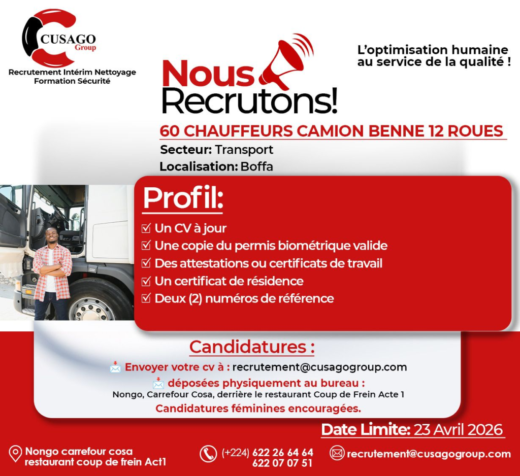 Dans le cadre du développement stratégique de l’un de ses partenaires opérant dans le transport de minerai à Boffa, Cusago Group lance une campagne de recrutement à grande échelle pour renforcer ses équipes terrain et managériales.