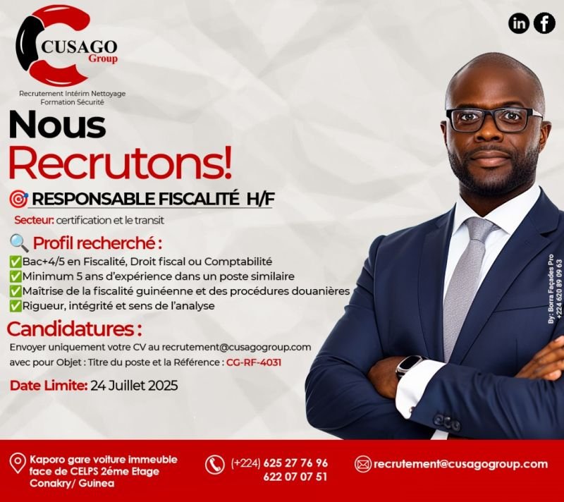 CUSAGO GROUP, recrute pour l’un de ses clients spécialisé dans la certification et le transit, un (e) Responsable Fiscalité. H/F
