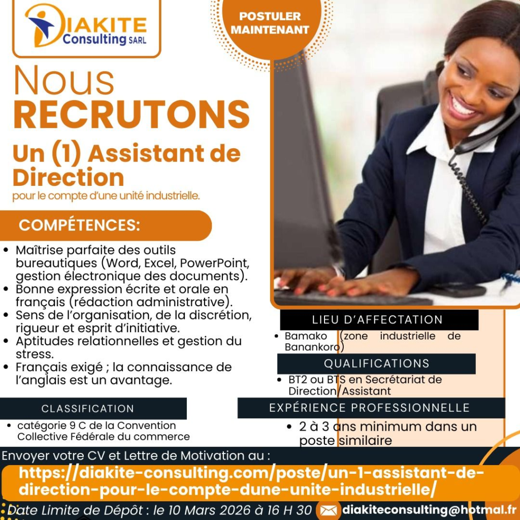 Nous cherchons un (1) Assistant de Direction pour le compte d’une unité industrielle.