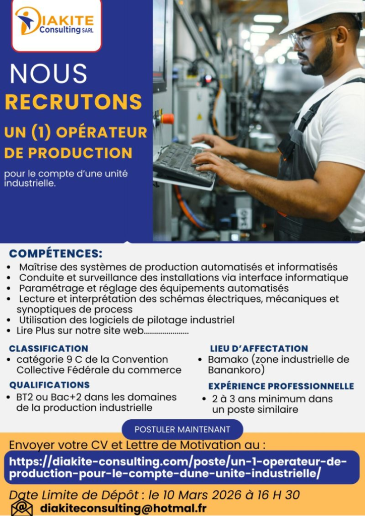 Nous cherchons un (1) Opérateur de Production pour le compte d’une unité industrielle.
