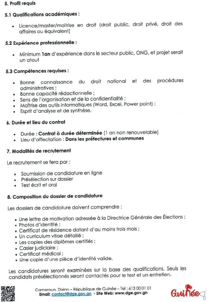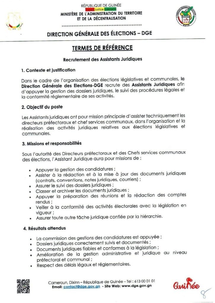 Dans le cadre de l’organisation des élections législatives et communales, la Direction Générale des Elections-DGE recrute des Assistants Juridiques afin d’appuyer la gestion des dossiers juridiques, le suivi des procédures légales et la conformité réglementaire de ses activités.