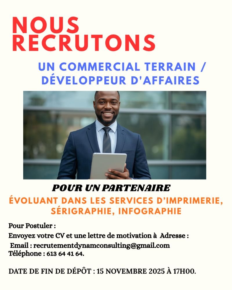 Pour Postuler : Envoyez votre CV et une lettre de motivation à Adresse Email : recrutementdynamconsulting@gmail.com ou Téléphone : 613 64 41 64.