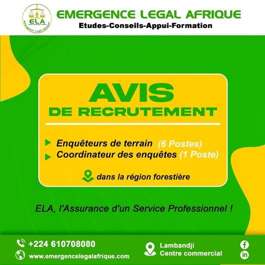 Emergence Legal Afrique lance un appel ร candidatures pour le recrutement de six (6) Enquรชteurs de terrain, ร raison d’un (1) par prรฉfecture, et d’un (1) Coordinateur des Enquรชtes pour la rรฉgion de la Guinรฉe Forestiรจre.
