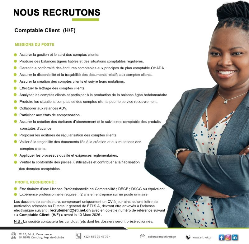 Les dossiers de candidature, comprenant uniquement un CV à jour ainsi qu’une lettre de motivation adressée au Directeur général de ETI S.A, devront être envoyés à l’adresse électronique suivant: recrutement@eti.net.gn avec en objet le numéro de référence suivant : « Comptable Clients (H/F) » avant le 10 Mars 2026.