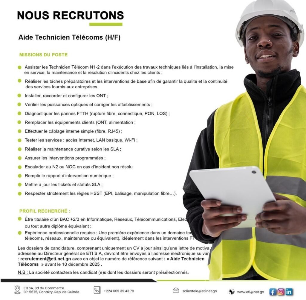 : recrutement@eti.net.gn avec en objet le numéro de référence suivant : << Aide Technicien