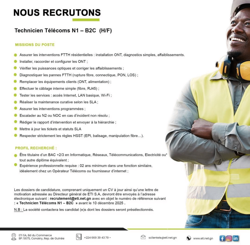 : <<< Technicien Télécoms N1 – B2C >> avant le 10 décembre 2025.